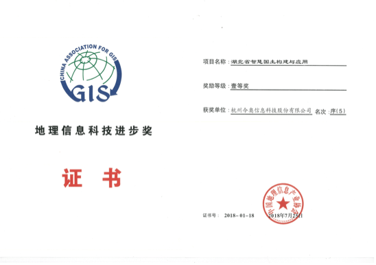 • 地理信息科技進步獎---湖北省智慧國土構建與應用一等獎